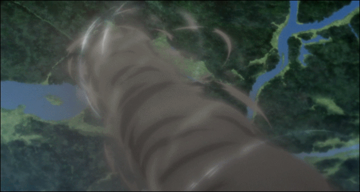 - Торнадо Тонери разрушает часть поверхности Луны, но я бы не стал напирать на то, что стоит дорисовывать окружность Луны, чтобы оценить масштабы, помня как в аналогичных моментах до этого был иллюстрирован кратер от пафосного и казалось бы огромного взрыва. Занятно, что под напором атаки почти моментально лопались птицы Сая, но команда ГГ (судя по Хинате) получила лишь минорный урон.