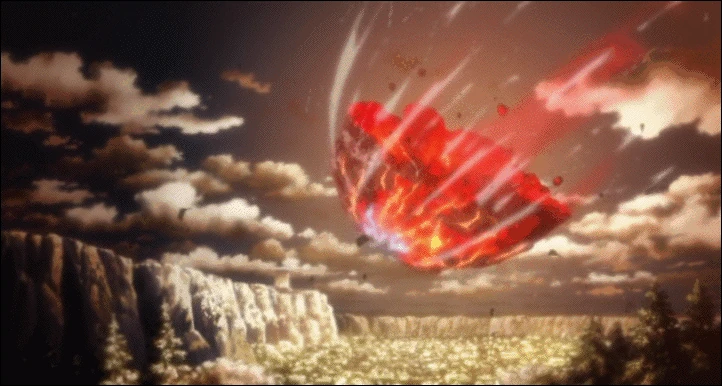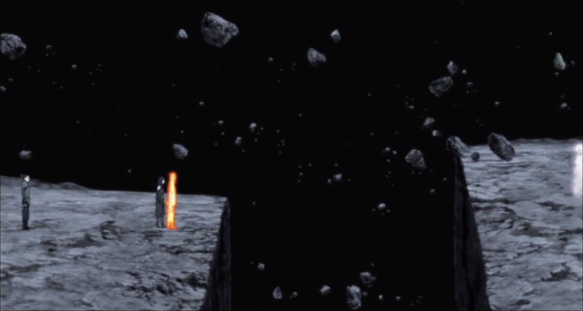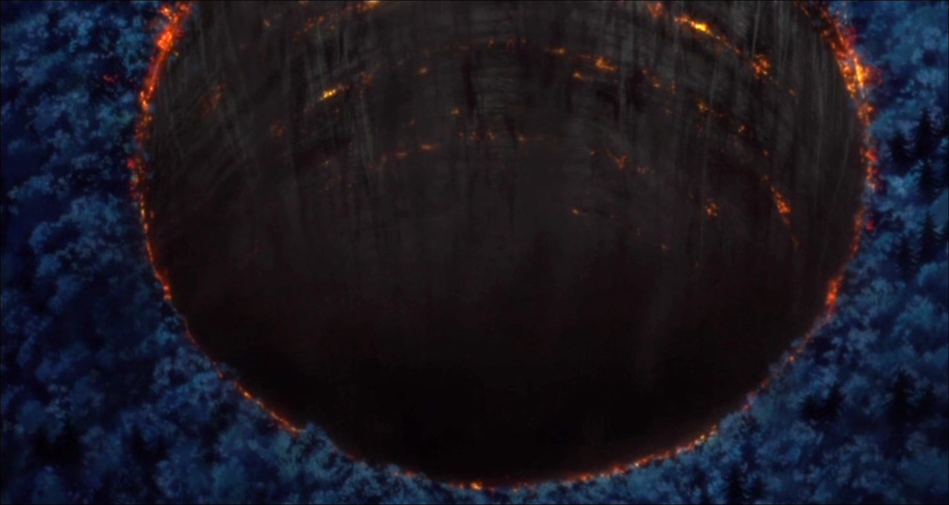 - 21 м. Пафосный взрыв от горящего обломка Луны (который быстро прилетел из неведомых далей, но не думаю, что за это стоит что-либо насчитывать в принципе, так как горящий метеорит банально мог быть не различим длительное время в небе), врезавшегося в землю где-то за Конохой, виден на фоне планеты из космоса. И впечатляющий кратер на месте взрыва, ахаха...