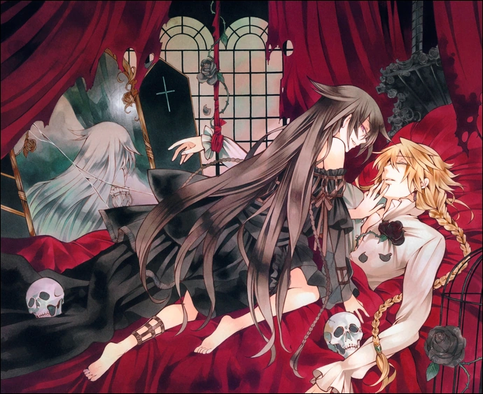 Близнецы『双生児』– более 100 лет назад Глен Баскервилль решил провести небольшой эксперимент, попробовав поместить Ядро Бездны в человеческое тело с целью узнать, сможет ли живое существо подчинить в себе силу, что лежит в основе всего сущего. Для этого он воспользовался сестрой своего будущего приемника – Лейси, которая по совместительству являлась ребёнком несчастий. Вначале глава Баскервиллей сделал так, чтобы девушка забеременела в Бездне, после чего низвергнул её на самое дно этого сверхъестественного мира. Там будущую мать сковали десятки железных цепей, что принялись медленно разрушать её тело, однако, как и задумывал Глен, не стали трогать ребёнка. В конечном итоге девушка растворилась во тьме, полностью прекратив своё существование, а Бездна стала колыбелью для 2 девочек-близнецов – чёрной и белой Алисы. Первая была выброшена в обычный мир, а вторая осталась в Бездне, став сосудом для его Ядра. Хотя во вселенной с момента низвержения Лейси прошла всего пара дней, девочки попали под влияние безумного временного потока золотого мира, в кратчайшие сроки достигнув подросткового возраста.