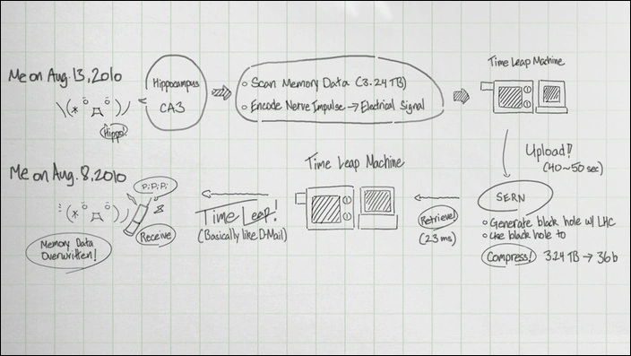 Оцифровка памяти ▪ 「記憶の、データ化 」 — технология, основанная на "Visual Rebuilding" и исследованиях Курису. С её помощью можно записывать нервные импульсы в зоне CA3 гиппокампа (где хранятся воспоминания) и конвертировать их в данные (и наоборот), которые можно хранить на носителях. Это делает возможным производить резервное копирование и трансплантацию памяти.Прыжок во времени ▪ 「タイムリープ 」 — термин, обозначающий явление, при котором человеческая память в запакованном виде отправляется в прошлое (в идеале — к тому же человеку), вследствие чего человек, знающий будущее, сам меняет его (что делает эту технологию более продвинутой, чем D-mail). Для успешного получения пакета человек должен ответить на звонок (как и D-Mail, эти данные передаются через телефон) и поднести телефон к уху.