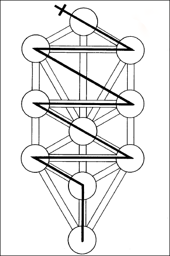 Падение с Древа Жизни – Древо Сфирот это не что-то, на что можно легко взобраться. К тому же, нечто так же может быть спущено оттуда. Сила, падающая с небесной точки, приобретает цвет и другие атрибуты по мере того, как она спускается по различным путям и в конечном итоге превращается в одно из множества субстанций в этом мире[?]. Когда пользователь магии преднамеренно обрушивает это, это походит на удар молнии. Чистая энергия устремляется к цели, даже если быстро трансформируется в материю. Алистер Кроули описал это как массу энергии, что может разорвать связи цели. Как символ, это подобно молнии с зигзагообразным путём к цели. Никакое другое заклинание не может быть более полезным для демона, что призван защищать три верхних Сфиры и существовал, чтобы препятствовать всем связям и разрывать мир на части.