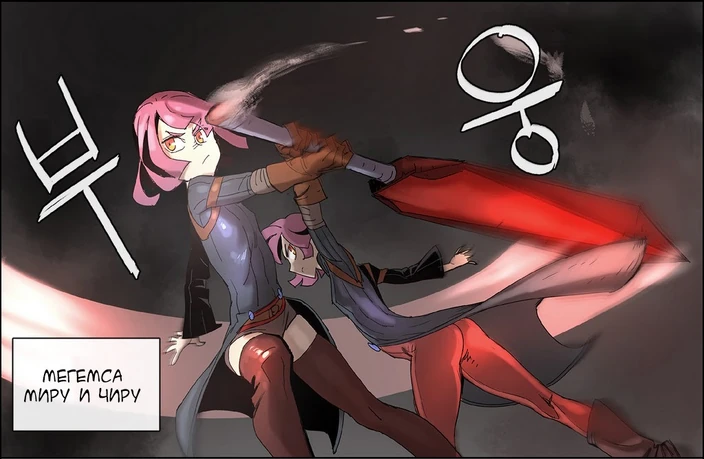 Двуручный меч: Увесистый двуручный клинок с огромным лезвием, который Миру и Чиру используют в паре, благодаря чему могут свободно развивать огромную скорость орудуя столь тяжелым орудием.