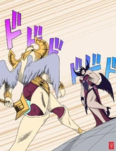 Умения, силы и способности: Сверхчеловеческие физические характеристики, сверхчеловеческие чувства, магия, манипуляции цепями, нечеловеческая физиология, манипуляции огнём, бессмертие (тип 2), манипуляции тьмой, барьеры, полёт, эмоциональные манипуляции, духовные манипуляции, владение оружием, фехтование ◄► Сверхчеловеческие физические характеристики, призыв, изменение формы, аура (катастрофы и разрушения), иллюзии (тип 5), манипуляции пространством, экстрасенсорное восприятие, бессмертие (тип 2, 5), телепортация, космическое путешествие, магия, мерные манипуляции, создание чёрных дыр, манипуляции энергией, манипуляции светом, манипуляции хаосом, мерные атаки, манипуляции жизнью, манипуляции гравитацией, огромный размер (тип 6), сопротивляемость (материальная, пространственная, временная, температурная, вероятно концептуальная)