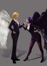 - Крылья — на спине Моргана растут четыре пары огромных вороньих крыла, которые обладают столь высокой прочностью, что об них ломается любой клинок. С помощью них Моргана способна летать и вести воздушный бой.