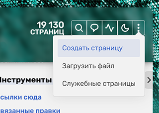 Создать новый профиль можно, используя пункт «Создать страницу» в меню в правой верхней части любой статьи на ACF. Нажав «сохранить» в открывшемся окне редактора, вы опубликуете профиль на вики.