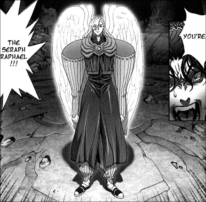 Серафимы - шестикрылые ангелы наивысшего ранга, воплощающие собой Солнце и любовь Бога. Рафаэль относится к группе четырёх сильнейших серафимов Небес и олицетворяет воздух.