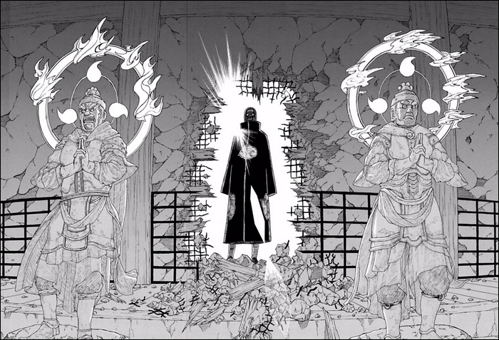 Сусаноо - материализации чакры Итачи в виде своеобразного демона, одновременно защищающего владельца (находящегося внутри) от атак противника и позволяющего ему атаковать, не открываясь для контратак. Сусаноо способно атаковать, и защищает Итачи от довольно мощных атак, но крайне быстро истощает его жизненные силы и ослепляет в считанные минуты. В зависимости от количества вложенной чакры размеры и свойства Сусаноо меняются: