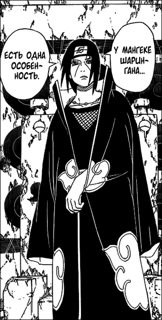 Мангекьё Шаринган - более совершенная форма шарингана, позволяющая использовать мощные техники ценой повреждения глаз, которые при использовании техник быстро слепнут.