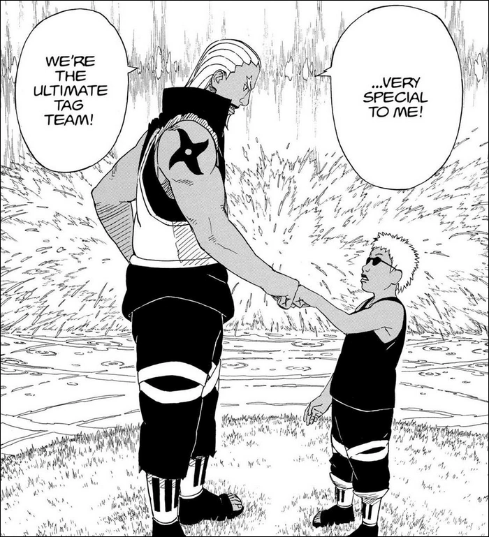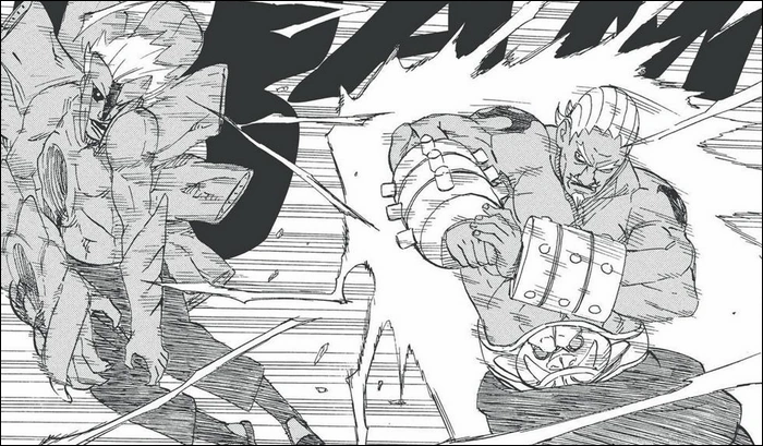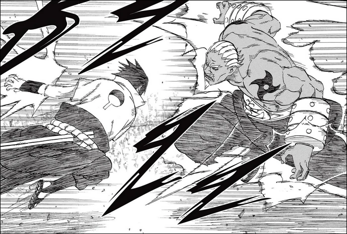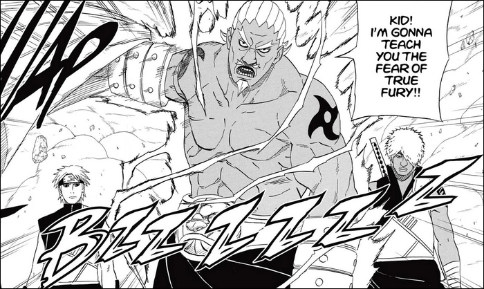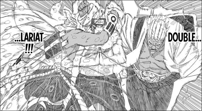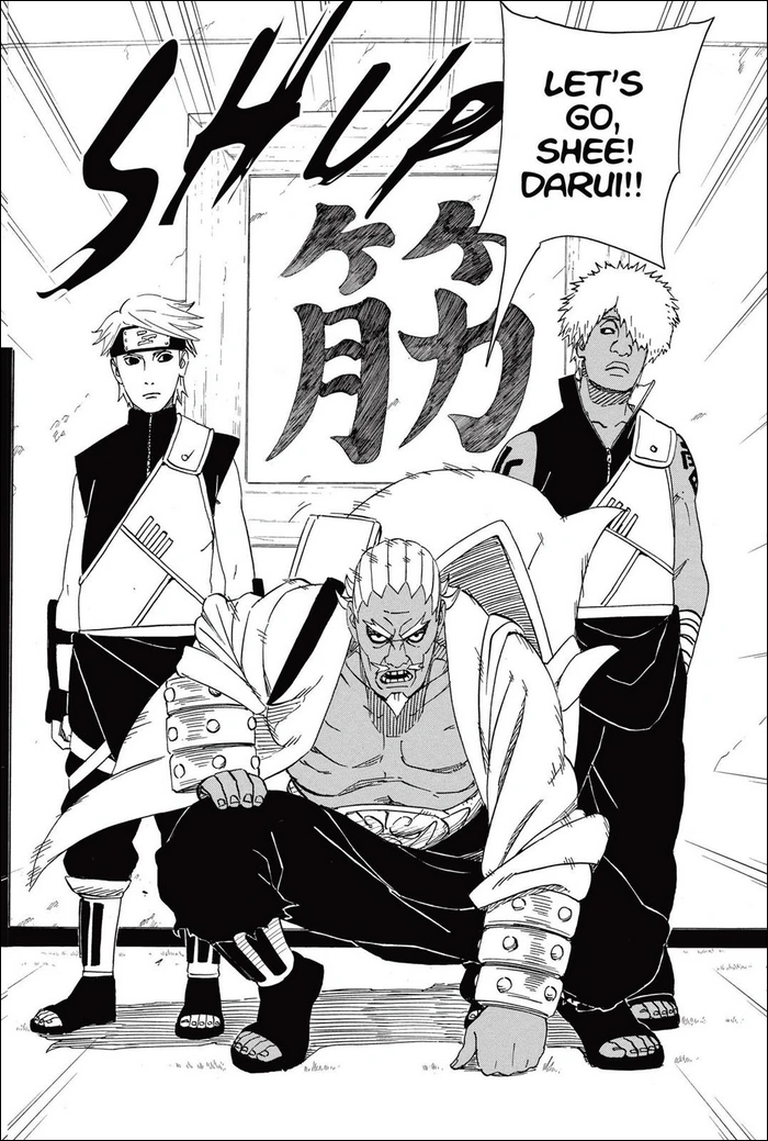 - Ускорение - концентрируя чакру в ногах, ниндзя значительно увеличивает скорость передвижения и становится способен на очень высокие прыжки. Несмотря на свою огромную силу, больше всего Эй выделяется именно скоростью, и на нее же часто делает упор в битве. На 2 уровне покрова был способен двигаться так быстро, что Саске с Мангекьё практически не мог за ним уследить.