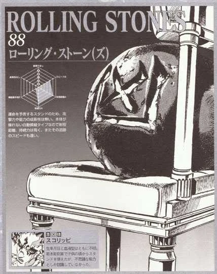 Стэнд - образ, который принимает жизненная сила человека, материализуясь в реальном мире. Этот образ называется стэндом. Стэнды обладают множеством сверхъестественных способностей. Rolling Stones выглядит как большой шарообразный камень с иероглифом высеченным на одной из его сторон.